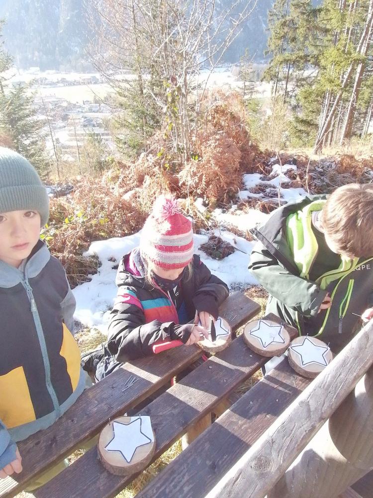 Nach dem Wichteleinzug in unserer Klasse 1a gingen wir auf der Suche nach Moos für unsere Sterne den Geoweg. Unterwegs basteln wir in der Sonne unsere Sterne aus Holzscheiben, Nägel und Moos. Auch Versteinerungen konnten wir entdecken. Am Rückweg hatten wir noch Spaß im Schnee.